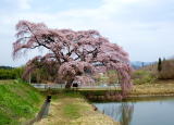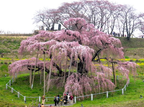 三春の名前は春になると梅、桜、桃、菜の花などが一斉に咲きだすことに由来する。この三春を代表する滝桜は日本一の一本桜。樹齢千年以上の紅枝垂れ。物凄く混雑するので、ホテルで朝食をせずに来た。