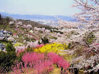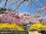 仙台から国道4号線を南下、福島県に入る。ハナモモ、桜、モクレン、ボケ、レンギョウなどが咲き、写真家の秋山庄太郎氏が福島に桃源郷ありと紹介して、有名になった花木生産農家集落の花見山公園。