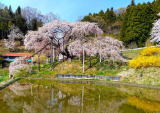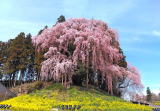 次は、ここから更に南下した中島地区の地蔵桜は小結、薄い紅枝垂れが池に映る。岩代町の合戦場の紅枝垂れは大関、八幡太郎義家が戦いをした場所が名前の由来。桜の下で菜の花が咲きだした。