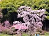 滝桜の子で不動尊の祠の側で咲く樹齢350年の上石の不動桜。室町時代を代表する水彩画家で、禅僧でもある雪村周継が晩年を過ごした庵跡に咲く雪村の桜、緑の竹林を背に桃が共演。雪村から郡山に向かう途中、集落の崖ぶちに咲く内出の桜を見届けて桜紀行を終える。