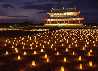 燈花会は奈良公園の興福寺、東大寺、浮見堂、春日野苑地など世界遺産一帯に1万本を超えるロウソクで優しく照らす行事。燈花とは灯心の花のようなかたちで、縁起がよいと伝えられている。