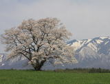 こに来た目的は岩手山を背にする弧高の一本桜。NHKの連続テレビ小説 どんと晴れで一躍有名になった。牧草の保護や防疫などの観点から近づけないが、残雪の雄大な岩手山を背に緑の絨毯の中に咲く。満開は2日後ぐらいになると係員が話していた。