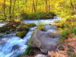 奥入瀬はブナ、トチ、カツラなどの黄葉樹林。背の低い紅葉したミズナラ、カエデが所々で混じる。水辺のシダやコケの緑が余計に紅葉を引き立てる。