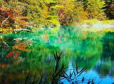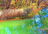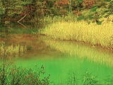 五色沼の入口にある一番大きな毘沙門沼。エメラルドグリーンの水面に黄金色の樹木や赤いモミジが映える。磐梯山を背景とする絶景のロケーション、誰もが写真にしたい場所。前回はこの毘沙門沼だけであったが、今回は桧原湖まで約4キロの五色沼自然探索路を歩く。