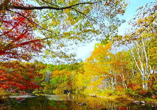 銚子大滝から上流を歩く人は極端に少なくなる。寒沢の流れ、万両の流れなどを過ぎて遡るほど紅葉が進む。やがて十和田湖の湖尻子ノ口水門で奥入瀬渓流は終わる。9キロを3時間半。朝、同じバスに乗った数少ない初老の日本人は健脚で既に到着していた。