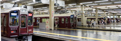 私鉄で日本一巨大な梅田駅ホーム。10分ごとに、京都、宝塚、神戸の3線が同時入発着する壮観さ。