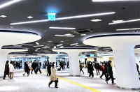 日本で初めてターミナルデパートの阪急百貨店が1929(S4)に完成。その地下1階に食料品売場ができた。1933年(S8)大阪地下鉄梅田駅が開業。1939年(S14)阪神梅田駅の地下化と阪神百貨店が地下店舗を開設して地下鉄、阪急、阪神が連絡通路でつながった。この場所が梅田地下街のルーツであり、中心となる梅田地下東広場。その後、地下街の拡張によって多方向に幾筋もの複雑な通路が広がり、行き交う人々が不規則に交差、最も遭難しやすい場所とされている。そのため、見通しを悪くしていた支柱を減らし、行先表示の改善など近年になってリニュアールされた。
