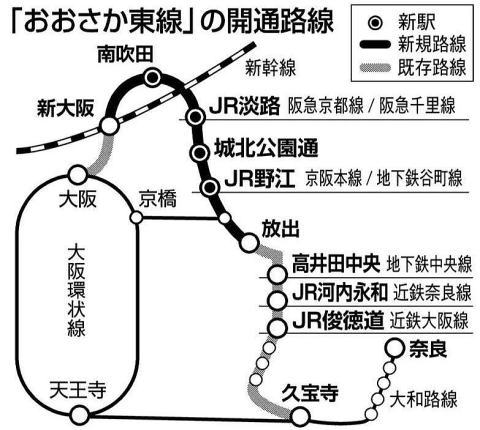 そのため、おおさか東線は東海道線の上を越え、踏切のない貨物高架線から関空・紀勢線や、北陸線特急などが発着する西端のホームに入線する方式に変更される。この影響でホームや線路の付け替え変更で開業が遅れている。