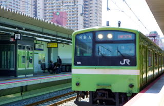 車両は古すぎる201系。大阪環状線から払い下げの鋼鉄製。朝夕や休日に運行される快速のみステンレス車体の321系となる。