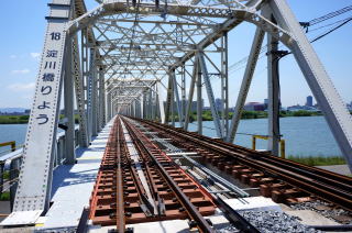 淀川を跨ぐJR赤川橋梁。もともと複線仕様であるが単線の貨物仕様のため、空いている片側を市道として共用提供されてきた。
