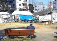 環状線と直交する南海線の新今宮駅から西成区となり、一転して空気が変わる。簡易宿泊所、アパート、露店小屋などが目立つ。シャッターや壁面に落とし書き。周りは圧倒的な放置駐輪車で埋め尽くされる。通称、釜ヶ崎・あいりん地区と呼ばれ日雇い労働や生活保護者が集まる特殊な地域。暴力団や過激派組織に煽動され、西成警察署が暴徒に包囲されるなど2000年前半頃まで何度も暴動が発生した。昨年、夢洲万博の前には、 3畳一間や2段ベットの簡易宿泊所、救済シェルターを設置して多数いた路上生活者を誘導したが、公園やガード下の簡易小屋や、テントで暮らす人が絶えない。午前中から手に手にカップ酒、タバコを持って公園で雑談。ベンチで孤独そうな人も見かける。殆どが高齢で生活保護受給者。大阪釜ヶ崎は東京山谷、横浜寿町と並ぶ三大ドヤ街。一時は立ち入りも危険であったが、警察、自治体、NPOなどの支援による治安、清掃活動で少しずつ改善されてきた。