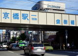 大阪城を見ながら片町を過ぎと、人と自転車がいっぱいの京阪電車とJR京橋駅。先程の京橋からは1キロ以上離れている。交差点に「左京みち 右大坂」、裏面は「右大和なり」と刻まれた文政9年(江戸時代後期)の石碑が立つ。京街道と大きく書かれたJR環状線ガードと国道1号線を潜り抜け京橋新京阪商店街に入る。