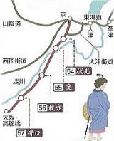 豊臣秀吉が大坂城との往来のため淀川左岸に文禄堤を築いている。これが京街道の起源。その後、徳川幕府は五街道を設定。東海道は京三条から江戸日本橋まで53の宿場を設けた。参勤交代が盛んになって、西国の外様大名が京都に立ち寄り、朝廷や公家と接触することを恐れた幕府は、西国大名が京都に入ることを禁止。山科の追分から伏見宿・淀宿を設け西国街道に誘導。さらに枚方宿・守口宿を加えて東海道を延長、宿場は57になった。