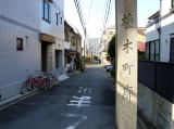 その先の西に蓮如上人が創建した西御坊の難宗寺、東側に東御坊の盛泉寺が建つ。いずれも格式の高さを示す5本線の壁となっている。難宗寺の角にはすぐ京街道、すぐ守口街道、御假泊所、御行在所と刻まれた石標が建つ。天皇の宿泊所であったことをうかがわせる。