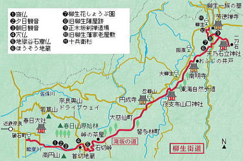 茶屋から春日山と高円山の谷あいの渓流に沿った「滝坂の道」を奈良市街地まで一挙に下る。この道は柳生新陰流が盛んになった頃、往来しやすい石畳に整備され、今もほぼそのまま残っている。