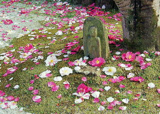 ここを有名にしたのは樹齢400年の五色椿。根元の風化した小さな石仏の周りにはらはらと散ってなを映える落ち椿、この時期にしか見れないため是非とも訪れたかった。