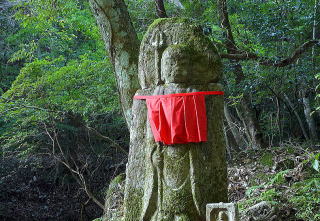 春日奥山原生林で覆われた道に地獄谷石仏群や春日山岩窟仏などがある。南都の僧たちの山岳仏教の修行場とされ多くの石仏が点在する。旧道と石畳の新道の分岐点に首切り地蔵が立つ。荒木又右エ門が試し斬りをしたという伝説が残る。