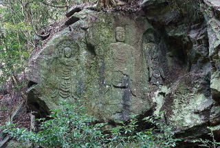 朝日があたる朝日観音磨崖仏、夕日があたる夕日観音磨崖仏はいずれも鎌倉時代の石彫とされている。時折行き交う人に出会う以外は川のせせらぎ、小さなダムの水音しかない。道端に横たわる寝仏を過ぎると木漏れ日の石畳も終盤、まもなく高畑の人家が現れる。