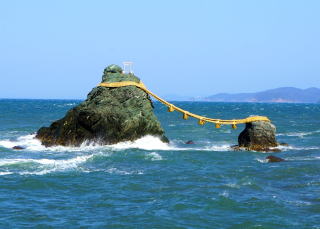 がっかりしながら夫婦岩のある二見興玉神社に行ってみた。沖合に沈む猿田彦大神の化身とされる興玉神石を祀る。夫婦岩はその神石を拝むための鳥居の役目とされている。