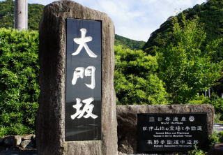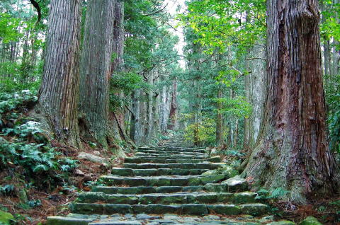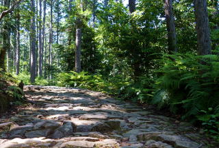 発心門から熊野本宮大社まで8キロの熊野古道はよく整備されている。緩やかに下る道筋にある93番目の水呑王子では弘法大師の伝説が残る。