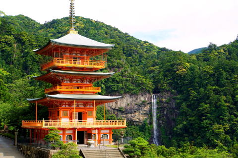 朱色の三重塔の向こうに那智の滝を望む景観は、熊野那智大社と青岸渡寺の神仏習合の一体感を表した名残りである。三重塔は平安末期に建てられたが江戸時代に倒壊、近年再建された。神仏習合の本地仏であった千手観音菩薩を安置している。