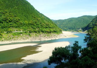 大阪から特急くろしお1号で紀伊田辺まで2時間、駅前からバス。富田川沿いの道、徐々に高度を上げて1時間半。熊野川沿いにある道の駅で下車。