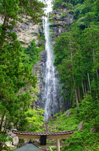 滝そのものが熊野那智大社の別宮である飛龍神社の神体。滝の神である大巳貴命は大地の神である大国主命の別名である。
