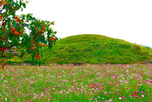この集落を抜けるとコスモス畑に囲まれた藤の木古墳。1985年(S60)未盗掘の状態で2体の人骨と共に煌びやかな副葬品が多数発見され国宝に指定された。古墳時代後期の円墳のため天皇に次ぐ地位にあり、ヤマト政権を支えた人物で、この頃に蘇我馬子に暗殺された聖徳太子の叔父の穴穂部皇子や、宅部(ヤカベ)皇子ではないかと推定されているが異説もある。