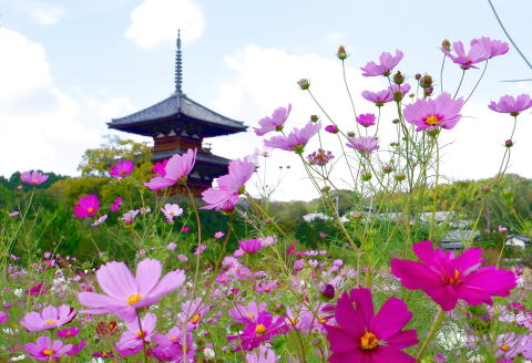 田畑一面に植えられたコスモス畑に斑鳩巡りの人達が次々と訪れる。絵を描く人、写真を撮る人など様々である。背後の法起寺は637年に創建されている。塔と金堂の位置が法隆寺とは逆の法起寺式伽藍配置と称される。国宝の三重塔は706年に完成したとみられている。