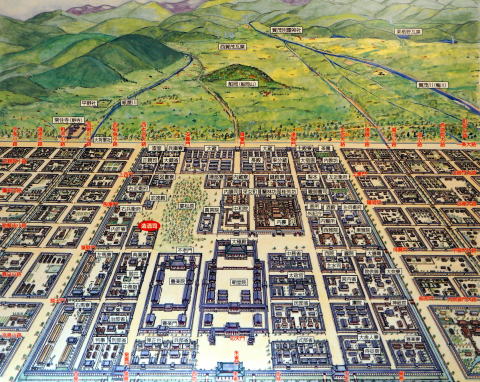 京都市のほぼ中央に所在した平安京。唐の長安をモデルに北の一条大路(一条通)から南の九条大路(九条通)まで5.2×4.5キロを碁盤の目に区画造営された。