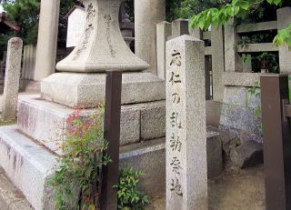 将軍家や室町幕府内の勢力争いから応仁の乱(1467年)が勃発。京都はその主戦場となり、貴重な建築物や文化財は大きな被害を受けた。相国寺北隣の御霊神社に応仁の乱勃発地の石碑がある。