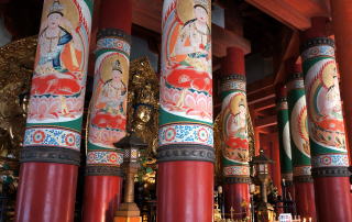 本尊の大日如来と柱に描かれた極彩色の金剛菩薩の曼荼羅が立体的に配置されている。曼荼羅とは仏の悟りや仏教観を視覚・象徴的に表記した絵画等である。