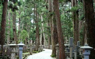 高野山の聖域、奥の院大師廟に向かう。その入口から樹齢数百年の杉木立が続く2キロの石畳沿道。両側に武将や大名家、企業など20万基を超すといわれる墓碑、供養塔が並ぶ。