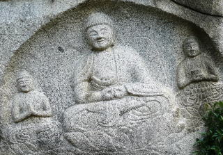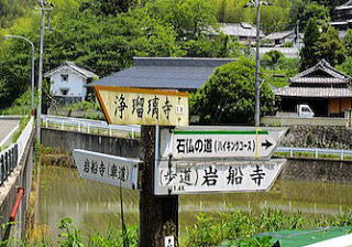 バス停まで、浄瑠璃寺道と呼ばれる小路に三体磨崖仏、笠の阿弥陀磨崖仏、お地蔵さんなどが点在。1丁(約109m)ごとに建てられた丁石笠塔婆も所々で残る。塔婆とは本来は釈迦の仏骨を納めた塔。後に中国や日本に伝わると三重塔、五重塔などに変化するが、鎌倉、室町時代の真言密教では空・風・火・水・地を表すとされる五輪塔が多く建てられた。高野山に行けば特に多く見られる。