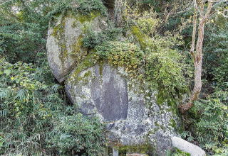 笑い仏と呼ばれる阿弥陀三尊磨崖仏。ほほ笑んだ観音菩薩・阿弥陀如来・勢至菩薩の三体が並んで彫られている。鎌倉時代後期から長年間ほほ笑み続けている当尾を代表する石仏。その横で半身が土の中に埋まった地蔵菩薩は眠り仏と呼ばれている。