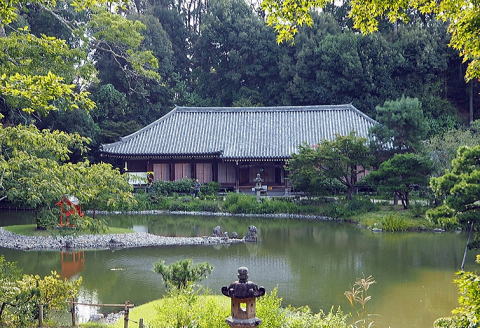 堀が記した「馬酔木より低い門」、素朴で小さい山門。静かな境内の中央苑池の西側に西方浄土の阿弥陀堂では九体阿弥陀如来が並ぶ。東側の三重塔に東方浄土の薬師如来を配する平安時代の代表的な浄土式庭園である。