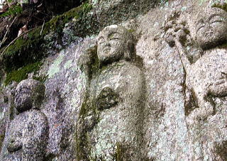 不動明王や二面磨崖仏、愛宕の灯篭と呼ばれる常夜灯などを通り過ごした先、ヤブ中の地蔵三尊磨崖仏は、地蔵菩薩、観音菩薩が並んで彫られ、もう一つの阿弥陀如来を彫った石を並べて配置。当尾地域で最も古い鎌倉中期のものとされている。いろいろな石仏と出会いながら浄瑠璃寺に向かう。