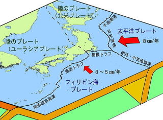 海溝よりも少し傾斜の緩い駿河湾から四国沖にかけて発生。