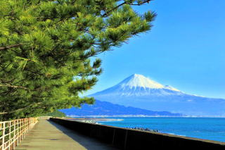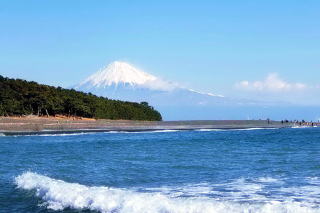 三保半島の最先端、真崎海岸に出ると富士山が真正面に迫る。海岸線には約3万本の黒松が植わり遊歩道が整備されている。サイクリスト、ジョガー、ウオーキングする人などが行き交う。遊歩道を軽快に自転車を走らせると汗ばむほど暖かい。