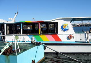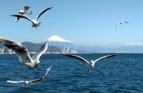 市場横の江尻港からレンタサイクルと一緒に水上バスに乗って対岸の三保半島に向かう。ユリカモメが手の届きそうな距離まで近づいてくる。富士山をバックに思わずシャッターを切る。