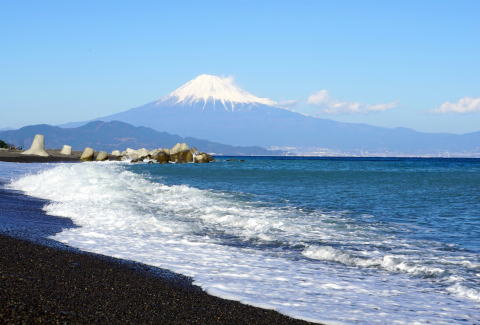 さらに進むと天女伝説で知られる羽衣の松。自転車を置いて波打ち際に降りてみる。富士山と青い海、黒い砂浜に押し寄せては引く白波。歌川広重の浮世絵や絵画でも描かれている名所である。