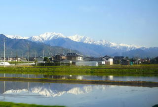 付近の田園には水が張られ、5月の連休明けから始まる田植えの準備中。その水面に北アルプスの白い山並みを映す春の風物詩、水鏡が各所でみられる。