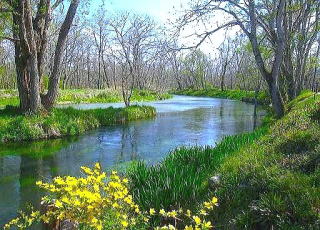 拾ヶ堰(ジツガセキ) 万水川沿いのせせらぎの小路を走る。小さなわさび田、湧き水公園などを巡り灌漑用水路、拾ヶ堰に向かう。江戸時代末期、水量豊かな上流河川から20数キロ程の水路を設けた。安曇野10村を潤したことから拾ヶ堰と名付けられた。その堰に沿ってサイクリングロードが設けられている。