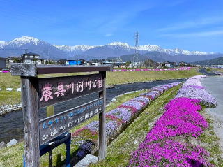 高台にあるアルプス展望所の大町桜公園、山岳博物館、芝桜が咲く農具川など塩の道を巡る。