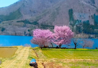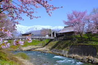 ホテルから小川沿いに歩いて30分程。白く輝く白馬鑓ヶ岳、杓子岳、白馬乗鞍岳と続く白馬連峰をバックに松川の清流、吊り橋、茅葺き屋根など白馬の原風景に、この日、満開宣言されたピンクのオオヤマザクラが色を添える。四季の中でもこの頃が最も美しいと言われる。しばらく時を忘れる。