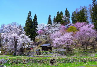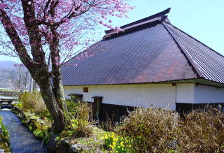 大糸線の北側が新田集落、昔の新田宿。今はスキー民宿が目立つ。集落の入口に道祖神や多くの石仏が並ぶ。雪解け水が勢いよく流れる水路脇にピンクのオオヤマザクラが咲く。茅葺き屋根やその上に金板を被せた民家が点在する。集落の小山の祠に咲く樹齢400年の桜は、植えた人の名前から徹然桜と呼ばれる。