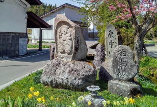 吊り橋を渡ると大出集落。茅葺きもあれば金板で覆った屋根もある。入口の小さな道祖神を見ていると、その農家の方から「今日の白馬は特別綺麗!」と声をかけられた。道端には水仙など春の花々が咲く。集落の中程には大きな道祖神、観音石仏、庚申塔などが集められ、花々に囲まれている。