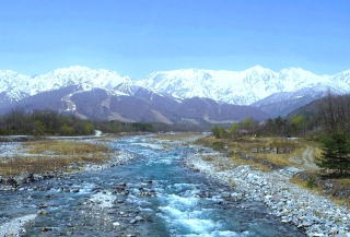 白馬八方 集落を抜けて、白馬をワイドに眺められる松川大橋に向かう。松川の河原堤にもピンクの桜が咲き、さらにその3キロ程上流にある白馬大橋まで来ると、白馬はより近くなる。