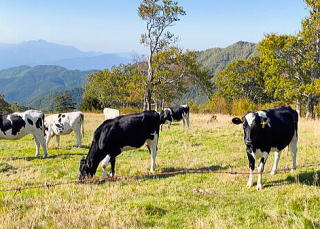 少し引き返して熊の湯から笠ヶ岳の麓を回り込むような県道を下り小布施、須坂を目指す。山田、七味、五色、蕨、小布施などの温泉が続くため「湯つつぎ街道」と呼ばれる信濃高山地区。この途中、標高1500mにある山田牧場。白樺の木立に牛が放牧されている。この牧場で飲んだ牛乳の濃厚さに驚く。