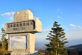 長野と群馬の県境となる渋峠を越えると、日本の国道の最高地点(2172m)を示す石碑。ダイナミックな山岳景気が続き煙を吹く浅間山が望める。国道を下ると草津温泉であるが、途中の草津白根山のガス濃度が高いため通行止めになっている。